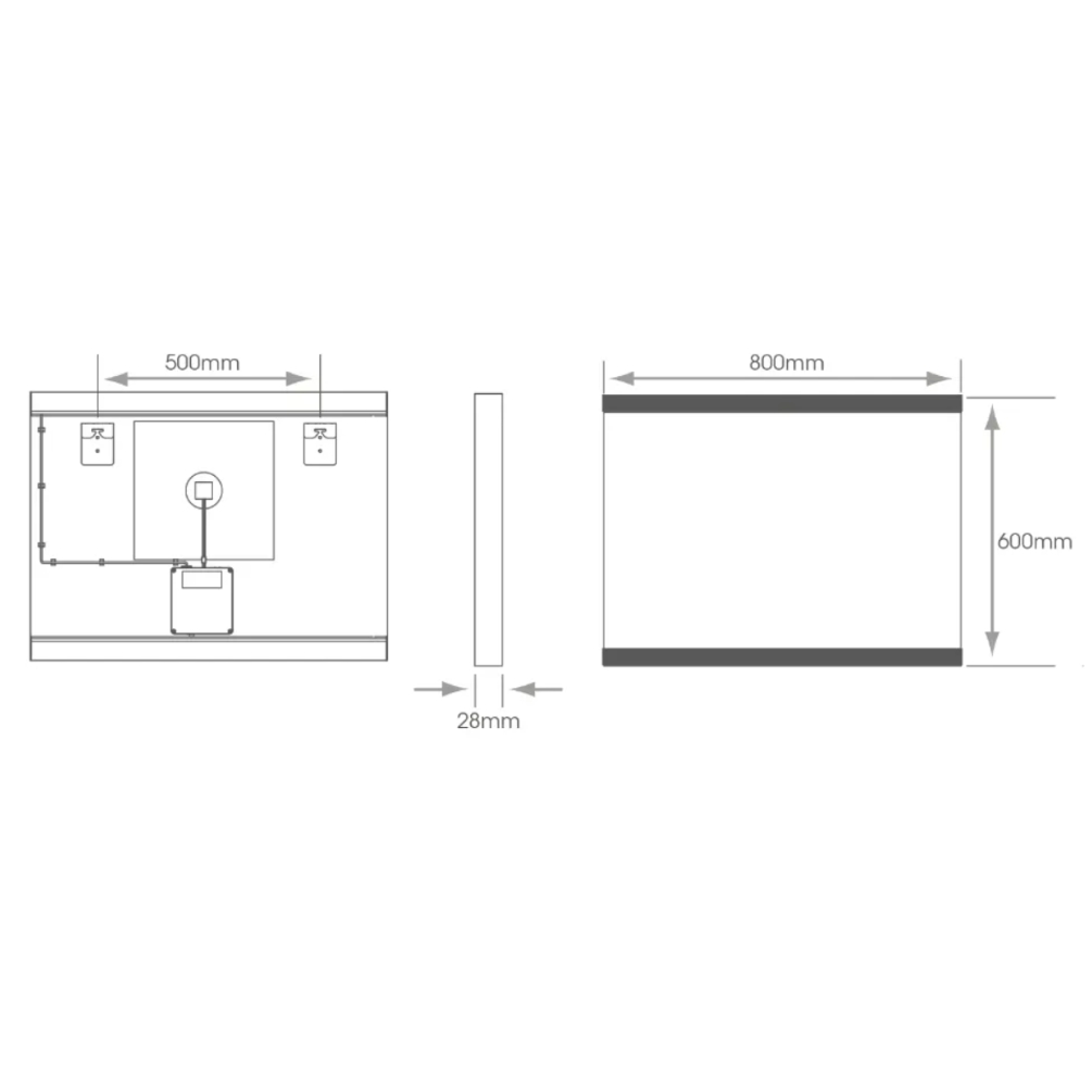 Measuring 800mm in width and 600mm in height, the rectangular mirror face of this illuminated bathroom mirror is framed by two parallel strips of colour changing LED lights, running along its upper and lower edge. These lights are operated via the two touch sensor buttons located in the centre of the mirror, which not only activate but allow you to adjust the brightness and warmth of the light the Hernan produces.