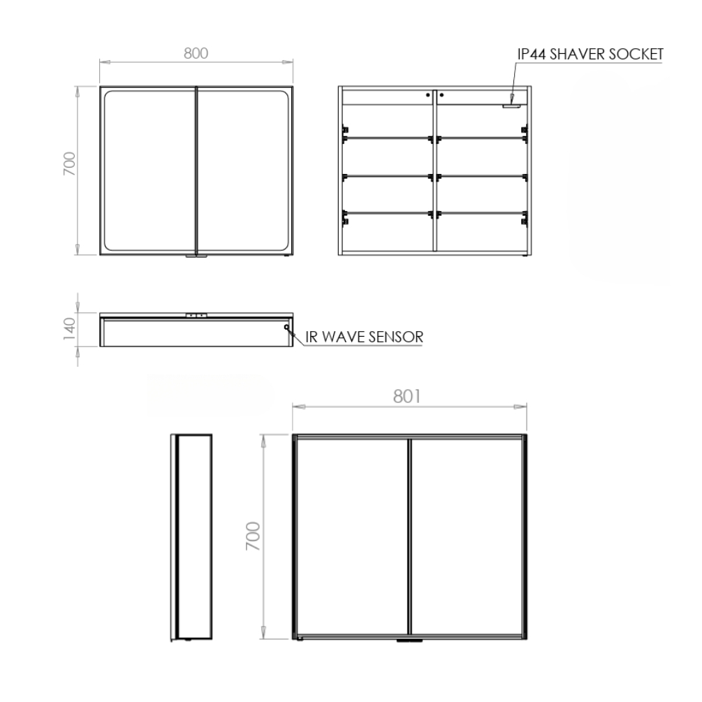 Enjoy crystal-clear reflection with built-in cool white LED lighting that frames the outside of the glass, offering excellent brightness for your daily grooming tasks. Additionally, a heated demister pad system located behind each door maintains clarity on the mirror, ensuring it's always usable, even in the most humid bathroom conditions. This considerate feature guarantees uninterrupted visibility when it's most needed. Both the lighting and demister can be activated without touch via a wave sensor located underneath. There’s also a built-in two-pin charging socket that provides dedicated power for electric toothbrushes and shavers, keeping your bathroom neat and your devices charged, free from trailing cords or searching for available plugs.