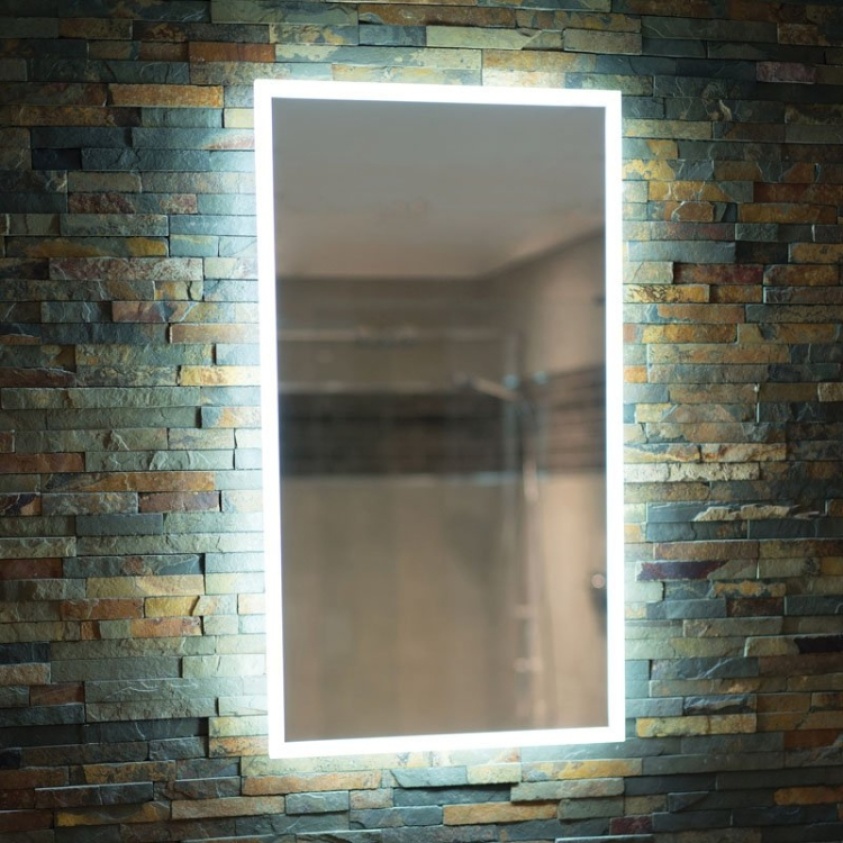 The mirror face of this rectangular mirror, which measures 450mm in width and 800mm in height, is enclosed within its dazzling frame of colour changing lights, which are controlled via the concealed infrared switch located on at the bottom of its right hand side.