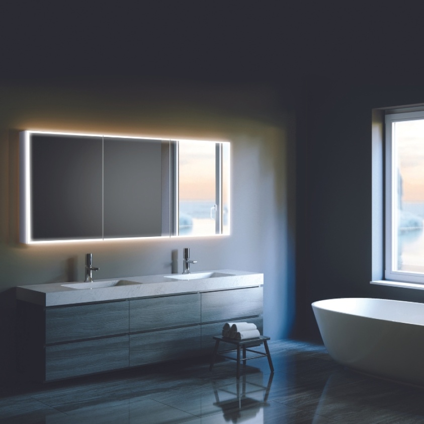 The triple doors of this illuminated mirror cabinet, which measures 1200mm in width and 700mm in height, feature inward facing as well as external mirror panels, giving you the freedom to check your mirror while perusing the contents of the cabinet. Measuring an additional 130mm in depth, the inside of the Qubic contain nine adjustable glass shelves alongside electric shaver charging sockets, such that you can organise your toiletries however you wish while still having space to keep your devices fully charged for whenever you next need them.