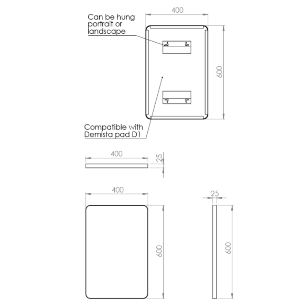 Measuring 600mm (H) x 400mm (W) with an ultra-slim 25mm depth, this wall-mounted mirror fits beautifully above single basins and vanity units. Its compact size makes it ideal for small bathrooms while still providing excellent reflection coverage.