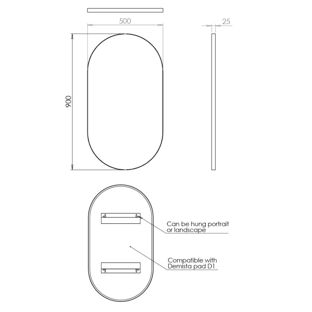 This mirror features a simple silhouette that works perfectly above a single basin for personal use. With dimensions of 900mm in height, 500mm in width, and a slim depth of only 25mm, it gracefully melds with different hues of wall colours.