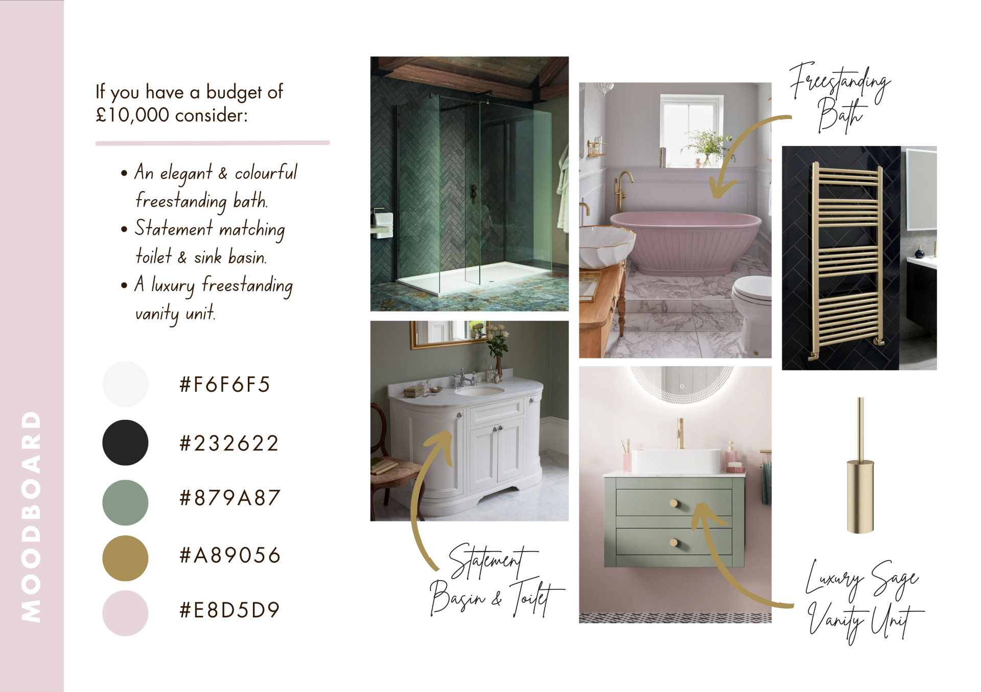 For a budget of under £2,000, adding black or brushed brass fixtures and fittings work beautifully when you’re updating your bathroom. These small changes make a big impact, and incorporate modern design easily and affordably!