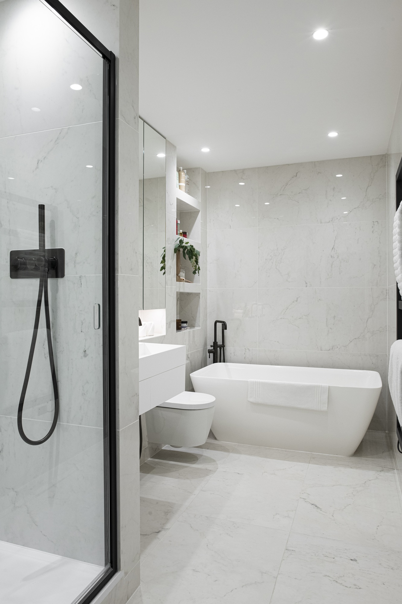 On what prompted the client to select this bath, Mischa comments: “The Vicenza Petite bath for Master Ensuite was a perfect balance between slick design and plenty of space for two to bathe in what would be classified as a small bath. We wanted a feature bath to lift the bathroom from its mundane purpose to a sanctuary where you can unwind. [It was] purposefully centred against bespoke mitre tiled niche to emphasise the luxurious hotel-like experience.”