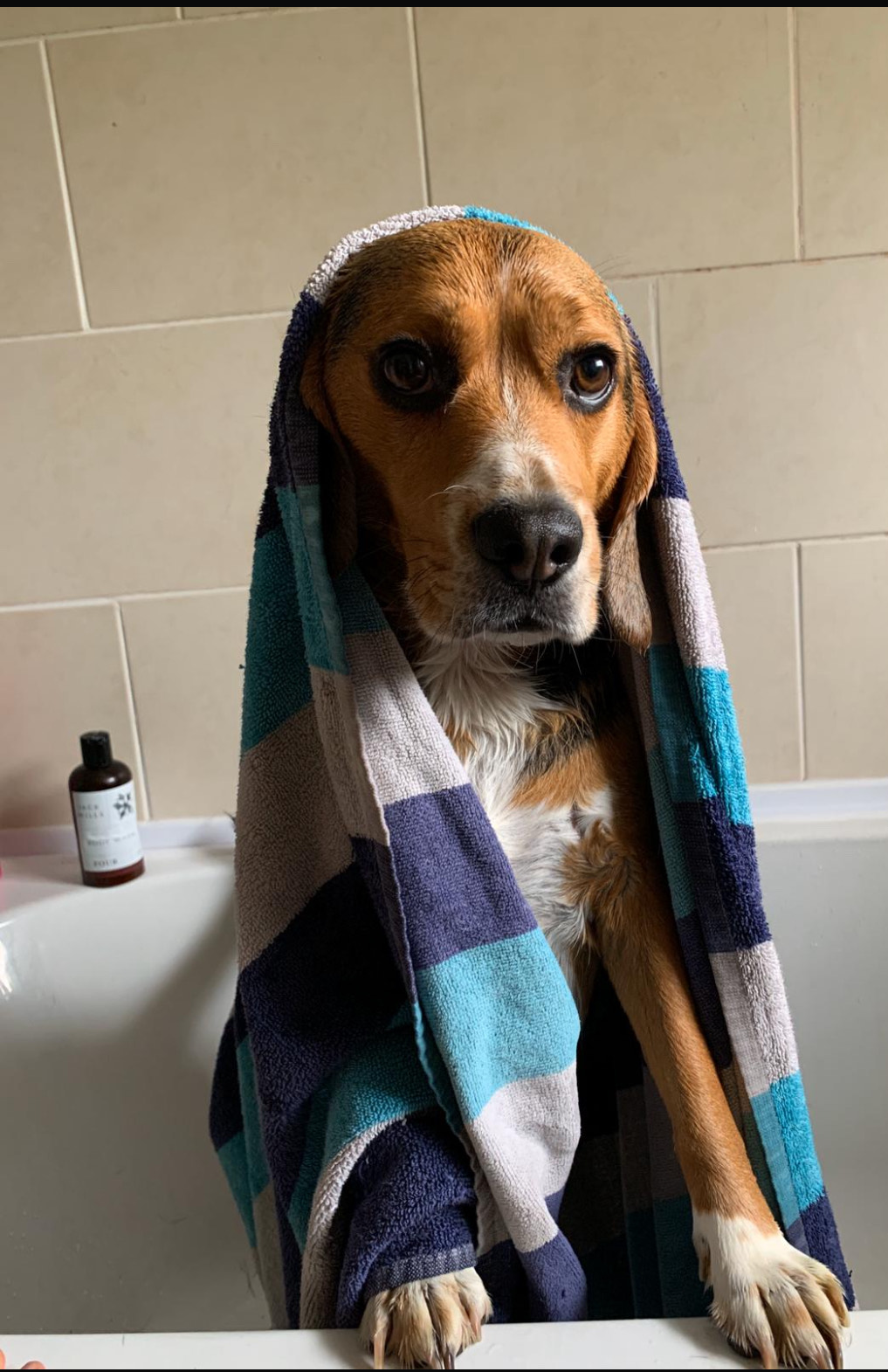 "Barney’s getting older and struggles with stairs now, so our walk-in shower has been a game changer for our after-walk routine. We added a textured, non-slip floor and a handheld sprayer to rinse him down. Beagles are particularly bad for rolling in things on walks - so we’ve had some disasters averted by that specific shower attachment! We also keep all his shampoo and a towel in a small basket under the sink – it makes the process smoother for both of us."