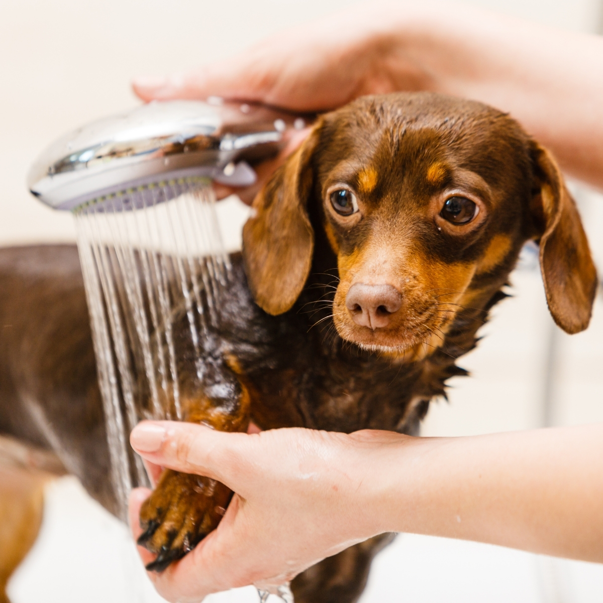 - Small dogs and cats may be bathed in a utility sink or basin.