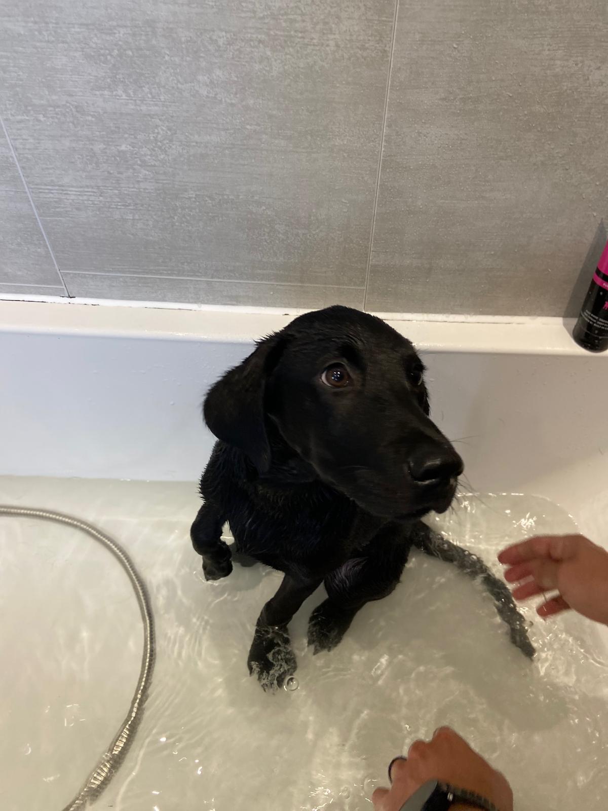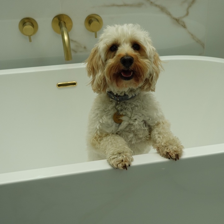 “Harry is an absolute water-lover, but he’s also a mud magnet. I’ve always felt like washing him in freezing water in the garden felt like a negative experience for both of us. So, after long walks, I bring him inside and use the bathroom. Having a low-entry shower with a non-slip tray means I can rinse him off without lifting or wrestling him into the bath, which has got harder as he’s got older and heavier! We added a handheld shower head and we keep all his bits – shampoo, towels, treats as bribes – in one cabinet in a little basket. It’s made after walk rinses quicker, easier, and way less stressful for both of us."
