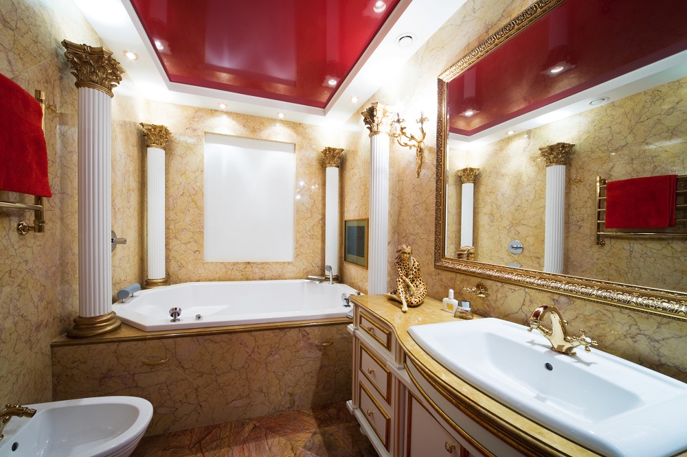 Some designers believe that certain off-white colours provide better accompaniments to yellow gold than pure white, stating that the warmth from the gold and coolness from the white creates too severe a contrast. If you share this opinion, then perhaps an off-white warmed with red or brown would provide a more appropriate backdrop to your bathroom.