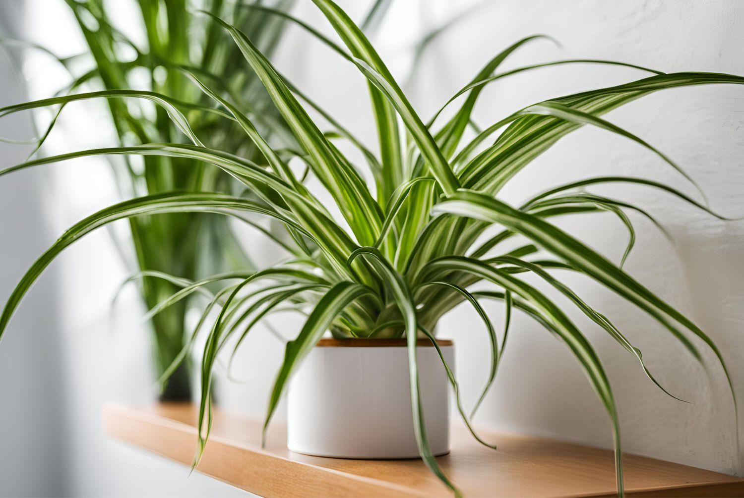 Spider Plants (Chlorophytum comosum) are a pot-bound plant, making them perfect for jazzing up bathroom shelves and bathroom cabinets. They are ideal for bathrooms due to their resilience in fluctuating temperatures and low light conditions. Additionally, their air-purifying qualities make them effective in removing toxins from bathroom air