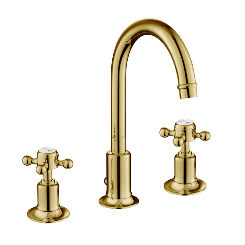 JTP Grosvenor Cross Polished Gold 3 Tap Hole Deck Mounted Basin Mixer.