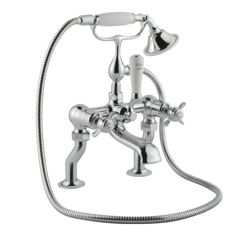 This bath shower mixer features a chrome finish with a single function handset and a traditional, deck mounted look, available with either black or white indices that will transform any traditional bathroom.