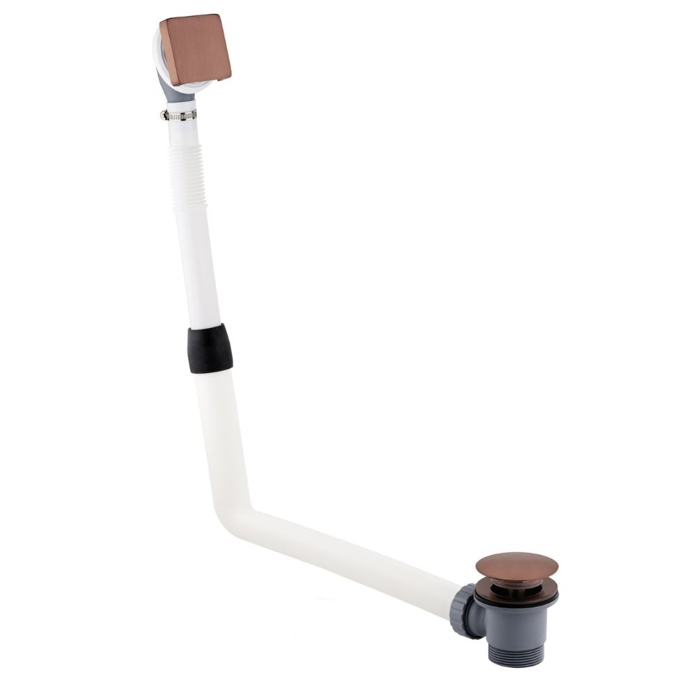 Finished in a sumptuous, warm brushed bronze finish that catches the light beautifully, this click-clack bath waste features a circular drain cover and a matching square overflow plate, both connected by a sleek white overflow pipe that runs cleanly along the side of the tub.
