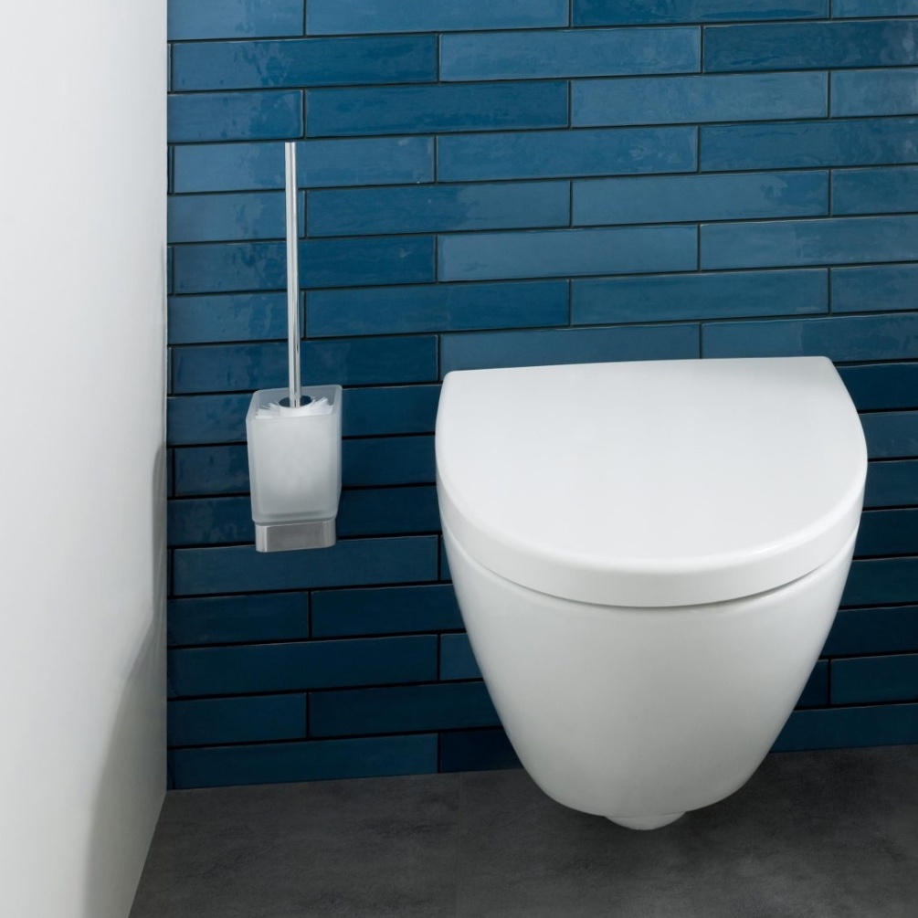 Measuring 75mm in width and 370mm in height inclusive of its brush handle, the chrome plated base of this wall mounted toilet brush holder connects seamlessly with the frost glass holder above it, their rounded rectangular corners instilling an uncommon softness in this often overlook toilet accessory.