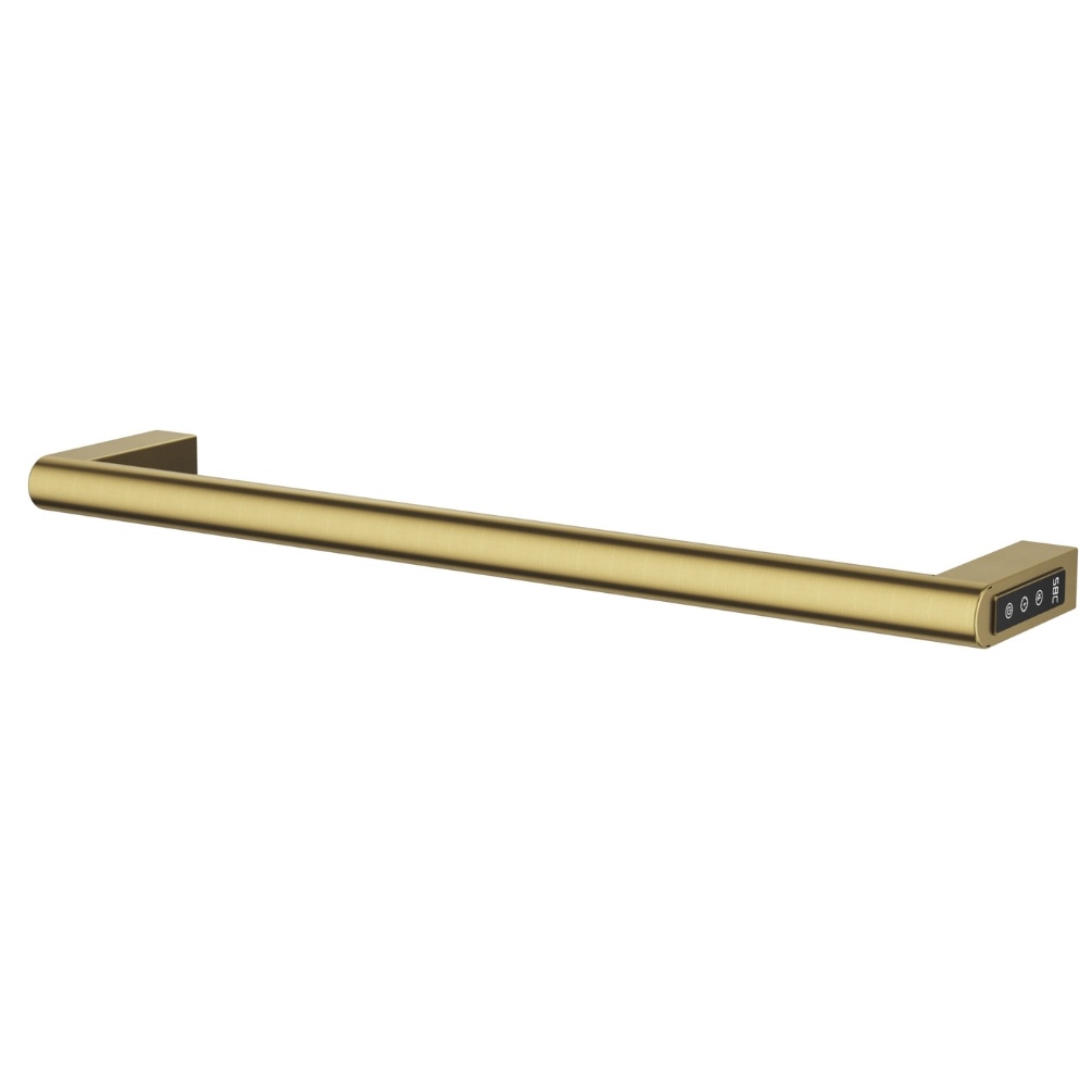 Crafted from a single solid stainless steel bar and finished in an elegant brushed brass coating, this heated towel rail combines durability with sophisticated design. With a slim 115mm projection, it provides generous hanging space while maintaining a streamlined, space-saving profile, which is ideal for smaller bathrooms or modern interiors.