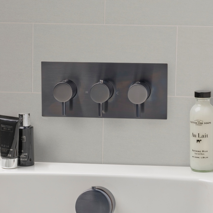 This triple outlet shower valve, which measures 120mm in height and 275mm in width, consists of the three identical dials mounted against their rectangular backplate, a sleek cylindrical handle extending from circumference of each dial to indicate its functional position while ensuring you can the dials are still grippable after your hands have become slippery with suds.