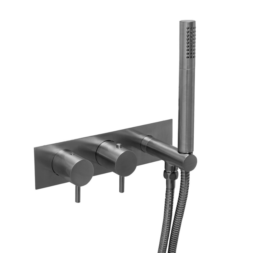 Supplied with a flexible shower hose and controlled via its cylindrical dials, the Vos Brushed Black Thermostatic Shower Valve with Handset is a practical yet attractive piece of brassware from the JTP collection that would embellish the contemporary style of your concealed shower system, while elevating the function of any modern bathroom.