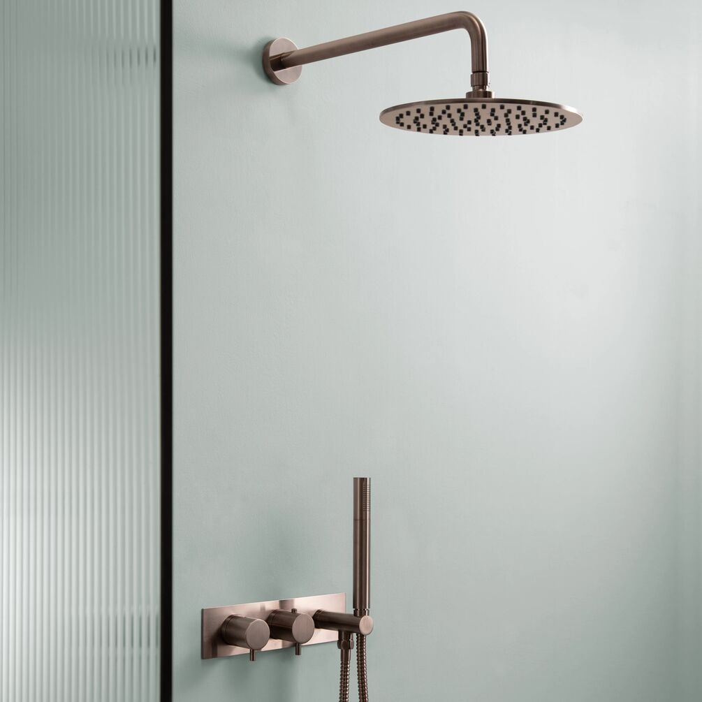 Featuring a slender, concealed look with a beautiful brushed bronze finish, this two-way mixer forms a striking control hub for your shower or bath. The first of its two outlets is occupied by a single-function shower handset, while the second outlet is left free to connect to any other accessory you might require. This could include a fixed shower head, riser rail kit, bath spout or overflow filler, giving you plenty of options to consider. This valve is also thermostatic, which means it automatically regulates water temperature to prevent scalding.