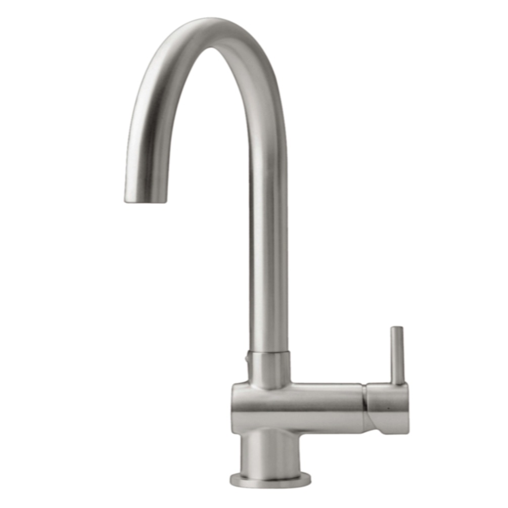 Turn the handle to mix hot and cold water and find the perfect temperature to flow through its fixed, curved spout and into the basin below.