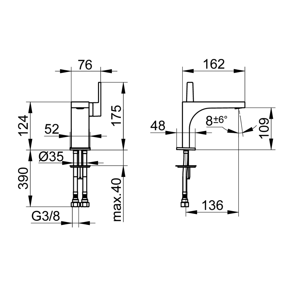 The angular tap body of this basin mixer, which measures 52mm in width and 124mm in height, is placed in direct contrast with its sloped underbelly that curves outwards to seamlessly its spout and front facing side, emphasising the clean geometricity of the product.