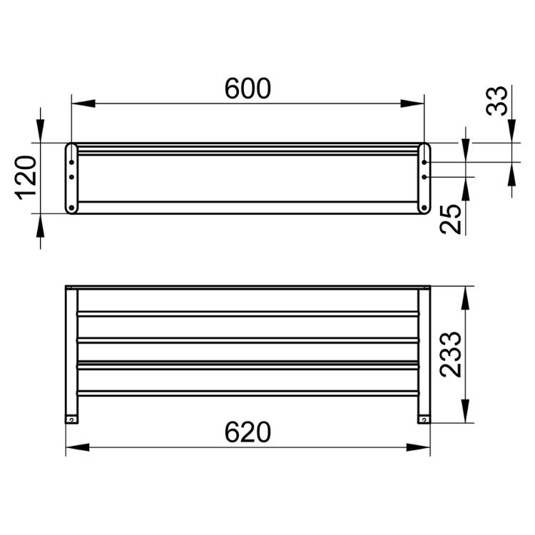 Cylindrical bars frame the rectangular outline of this captivating towel rack, which measures 620mm in width and protrudes 233mm from the wall, providing plenty of space for the storage of multiple towels. Below the four slick bars that form the shelf, there is a final bar from which an additional towel can be hung to dry, which connects to the body of the Elegance Towel Rack by its 120mm high wall mount.