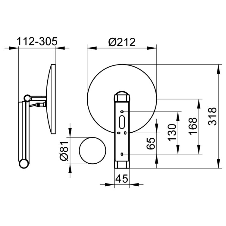 The mirror face is connected to a pivoting arm, which extends 305mm from its wall mount and allows you to adjust the mirror in three dimensions. Simply placing your hand behind the mirror face allows you turn this cosmetic mirror left or right, pull it forwards ad backwards as well as angle it up and down, such that you will always be able to find the right angle to suit your needs.