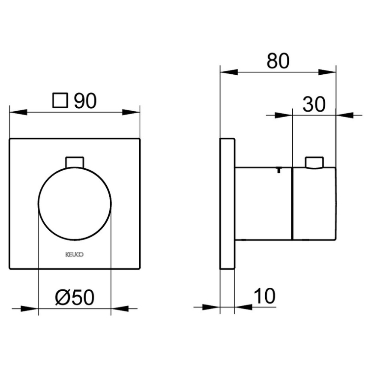 This thermostatic mixer valve, which measures 80mm in depth and 50mm in diameter, comprises of a cylindrical dial with a small button on its circumference, mounted against a square shaped backplate to add an extra dimension to its geometric design.