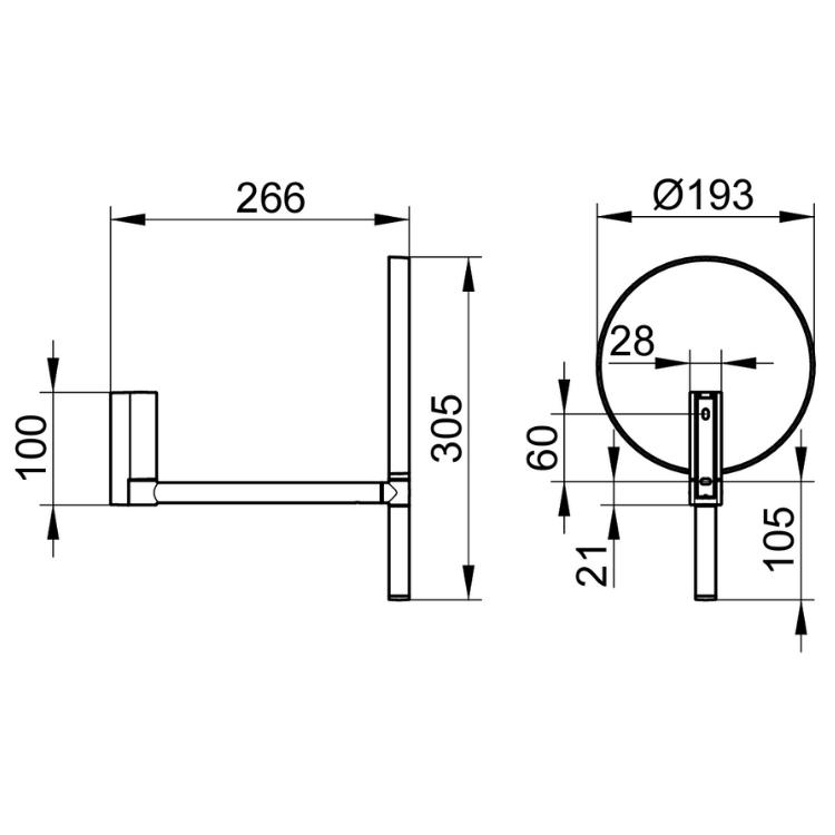 The mirror face is attached to a pivoted arm, which extends 266mm from the wall mount and allows you to adjust the mirror in three dimensions. Simply holding the cosmetic mirror by the cylindrical bar at its base, which gives this accessory its total height of 305mm, then begin to rotate the mirror from side to side, back to front, or even upside down until you have found an angle that suits your toiletry task.