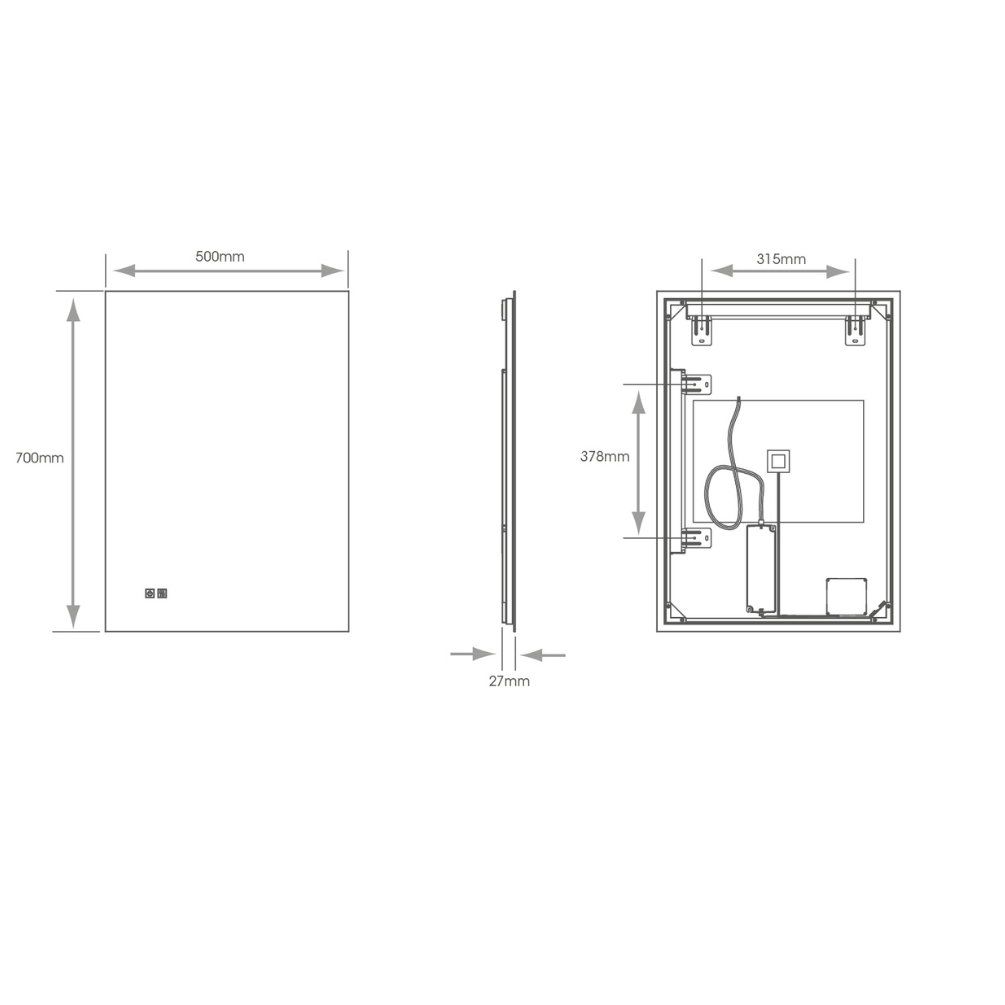 Measuring 500mm in width and 700mm in height, the refined edges of this rectangular mirror are accentuated by its backlit colour changing LED lights, creating the illusory impression that its sleek mirror face is levitating off your bathroom wall. Activating and adjusting the light settings is controlled via the two touch sensor buttons, located in the bottom left hand corner of the mirror face.