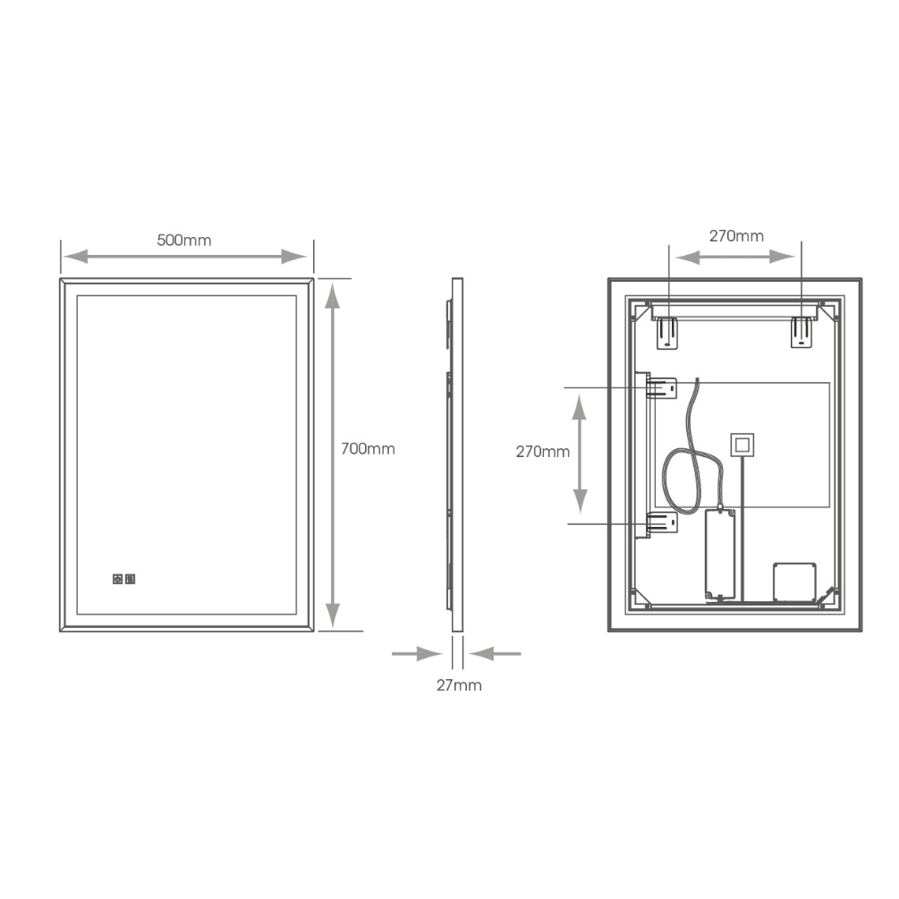 The rectangular face of this illuminated bathroom mirror, which measures 500mm in width and 700mm in height, is outlined by its matt black frame, giving the mirror greater presence on your bathroom wall while emphasising its refined angular design. Running parallel to the frame is a continuous strip of LED lights, which are operated via two touch sensor buttons located in the bottom right corner of the mirror face.