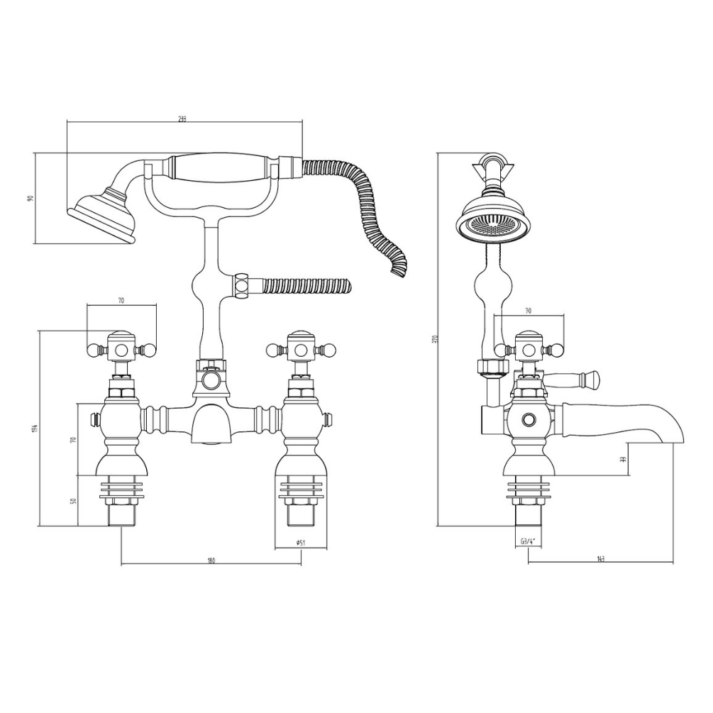 The crosshead handles, adorned with additional white ceramic, located on either side, facilitate precise and effortless control over water flow. The handset is connected to a gracefully slender hose, which ensures flexibility and sufficient reach during operation. When not in use, the handset can be conveniently placed on a discreet, traditional-style mount. A central lever enables a seamless transition between filler and handset modes.