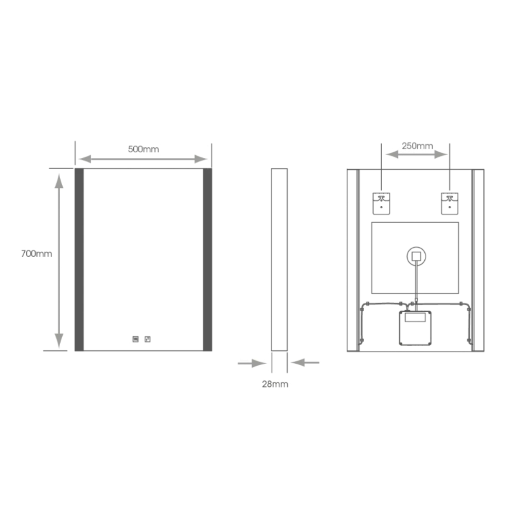 Measuring 500mm in width and 700mm in height, the rectangular mirror face of this illuminated bathroom mirror is lined with strips of colour changing LED lights on its left and right edges. These lights are operated via the two touch sensor buttons located at the bottom of the mirror face, which provide comprehensive control of their brightness and colour temperature.