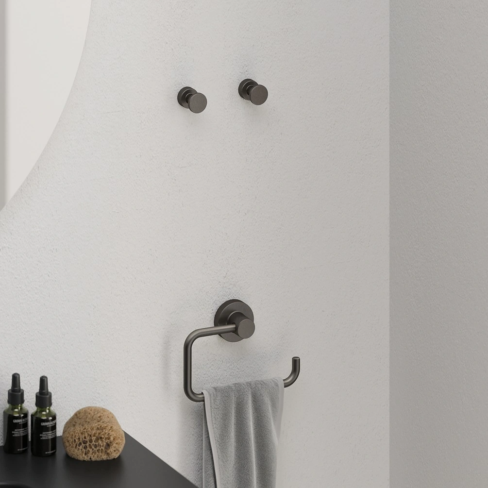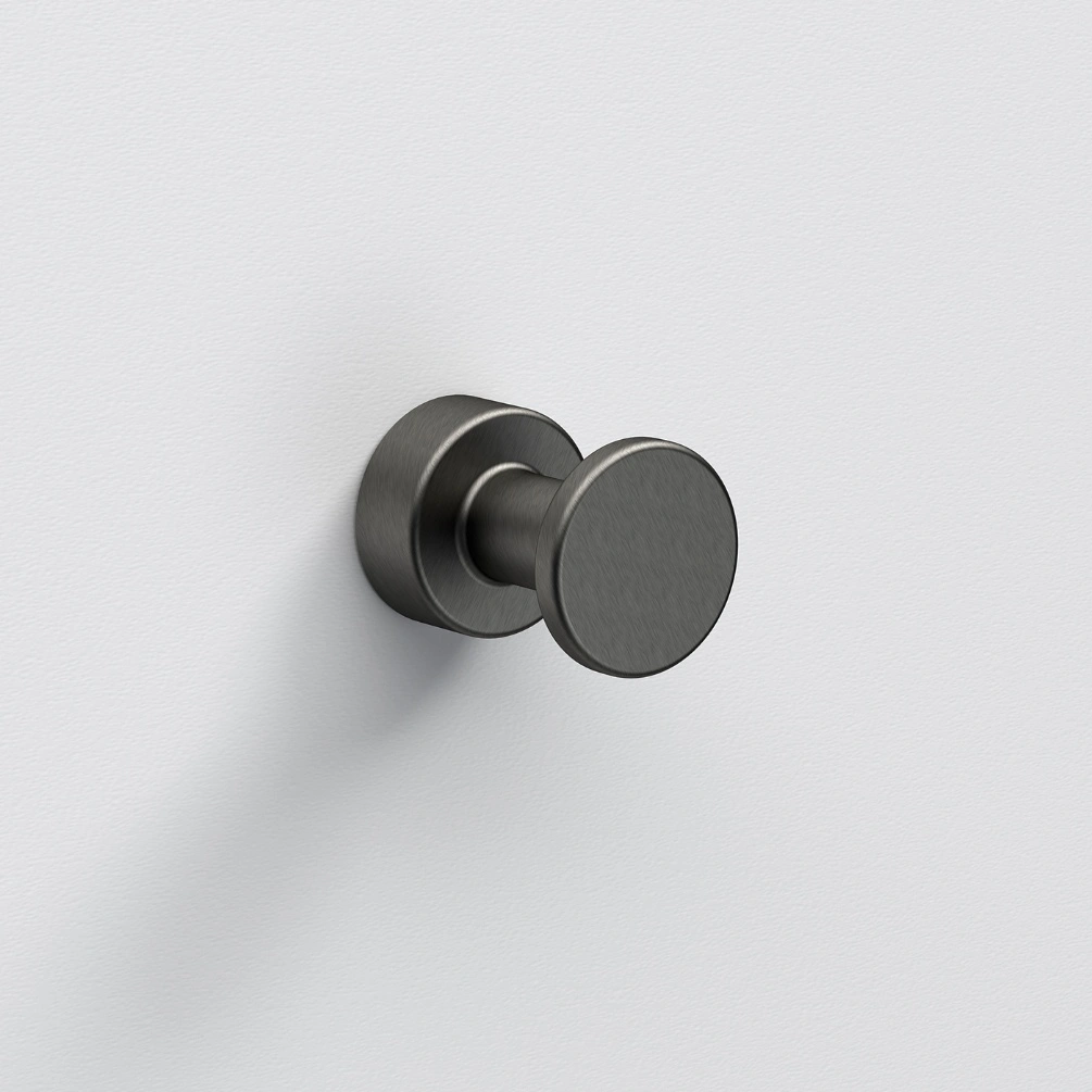 Featuring a timeless curved design, this sleek cylindrical robe hook, finished in an elegant gunmetal grey, pairs beautifully with round fixtures, making it a versatile choice for a variety of interior styles.