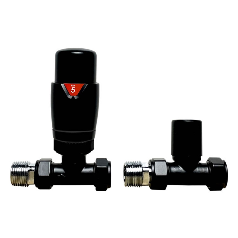 Presented in a sleek, rounded shape with a beautifully rendered black finish, this straight valve set is best paired with matching black radiators and towel rails. They're built to connect your radiator to your central heating pipework through the floor, as long as the radiator itself has inlets located on the bottom.
