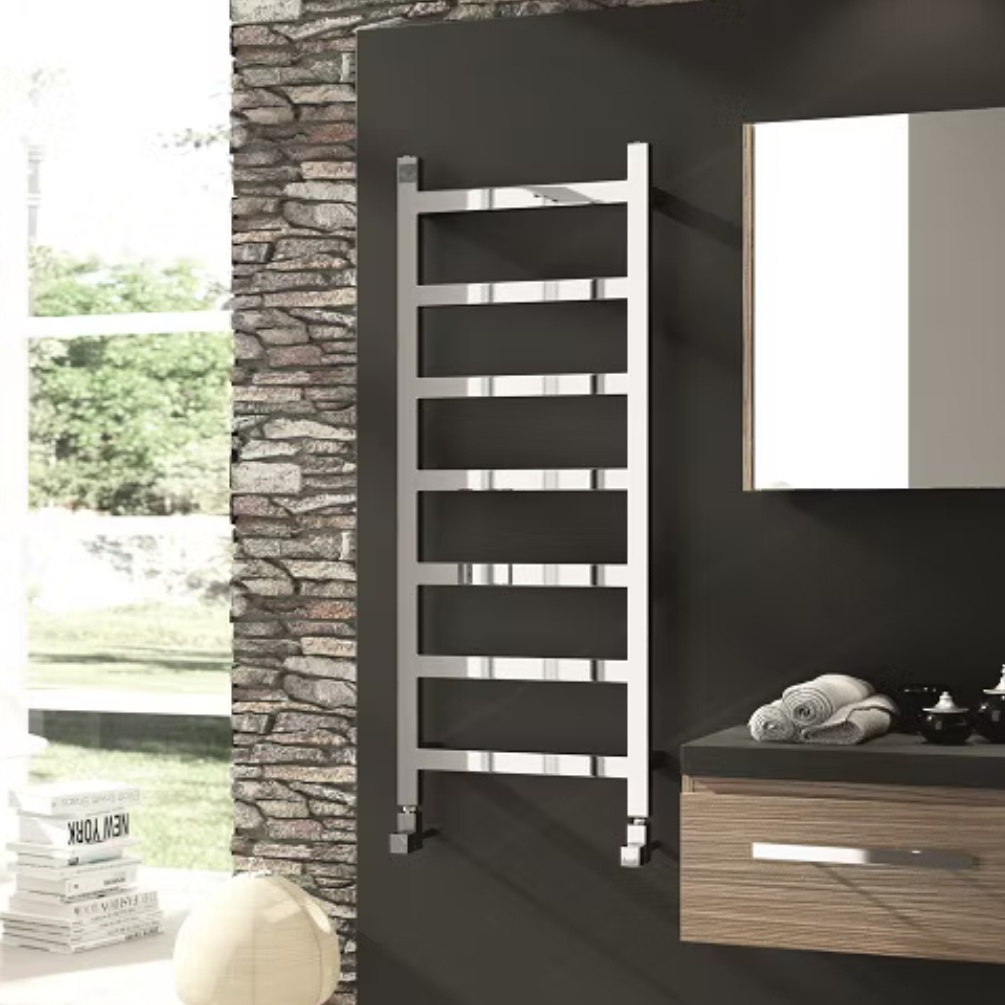 Standing tall at 1225mm and spanning a sleek 500mm, this medium-sized heated towel rail provides seven cleverly arranged horizontal bars, making it a breeze to hang your towels easily. With its robust square tubes and dazzling chrome finish, this towel rail adds a touch of modern elegance that will make every bathroom feel like a luxurious retreat.