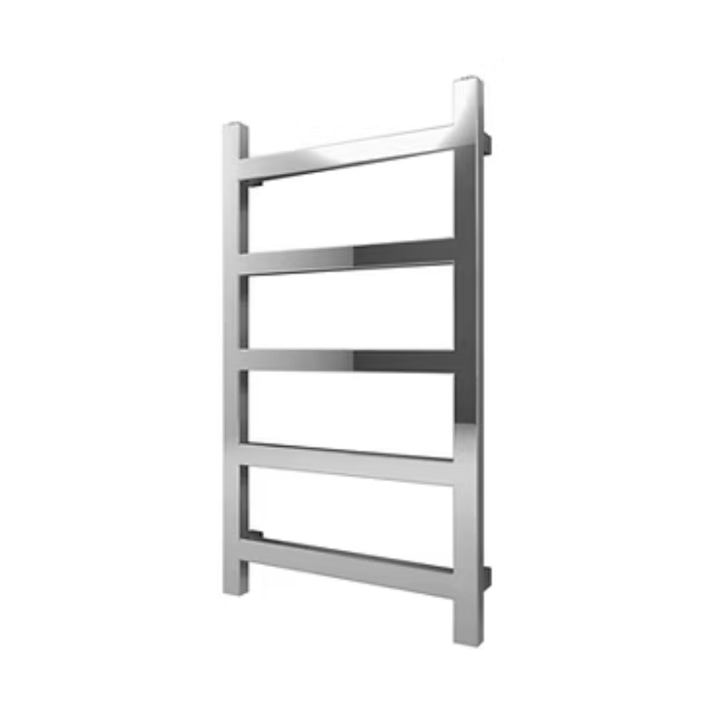 Measuring a generous 875mm in height and 500mm in width, this compact heated towel rail showcases an efficient layout with five meticulously aligned horizontal bars in the form of robust square tubes crafted in a ladder configuration. This design maximises the rail's hanging capacity and allows easy access to your towels, ensuring they remain warm and ready for use after a shower or bath. Enwrapped in a polished chrome finish, it culminates in a quintessentially modern design that brings a sense of serenity and sophistication.