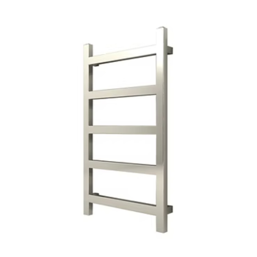 At compact measurements of 875mm in height and 500mm in width, this compact heated towel rail features an efficient arrangement with five carefully positioned horizontal bars designed as sturdy square tubes in a ladder formation. This structure optimises the rail's capacity for hanging towels and provides easy access, ensuring your towels stay warm and ready to use after a shower or bath. Finished in polished stainless steel, it showcases a distinctly modern design that brings a sense of tranquillity and elegance.