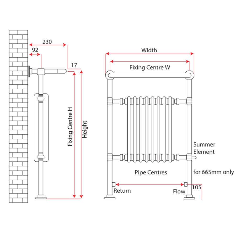 - Please Note: Please allow a minimum of 100mm for valves; summer element will affect pipe centres; flow and return can be reversed.