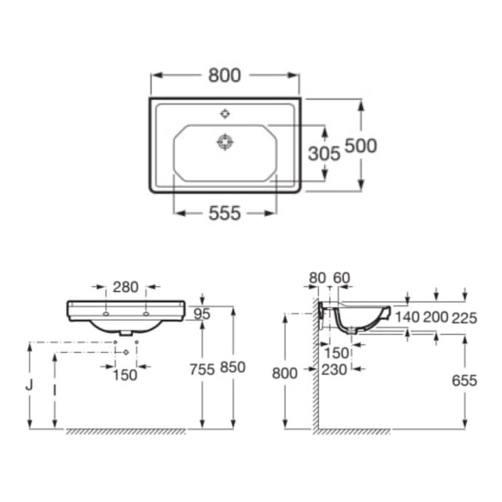 With a width of 800mm and a projection depth of 500mm, this traditional wall-hung basin showcases soft, classic lines that bring poise and character to its rectangular design, offering distinction and definition.