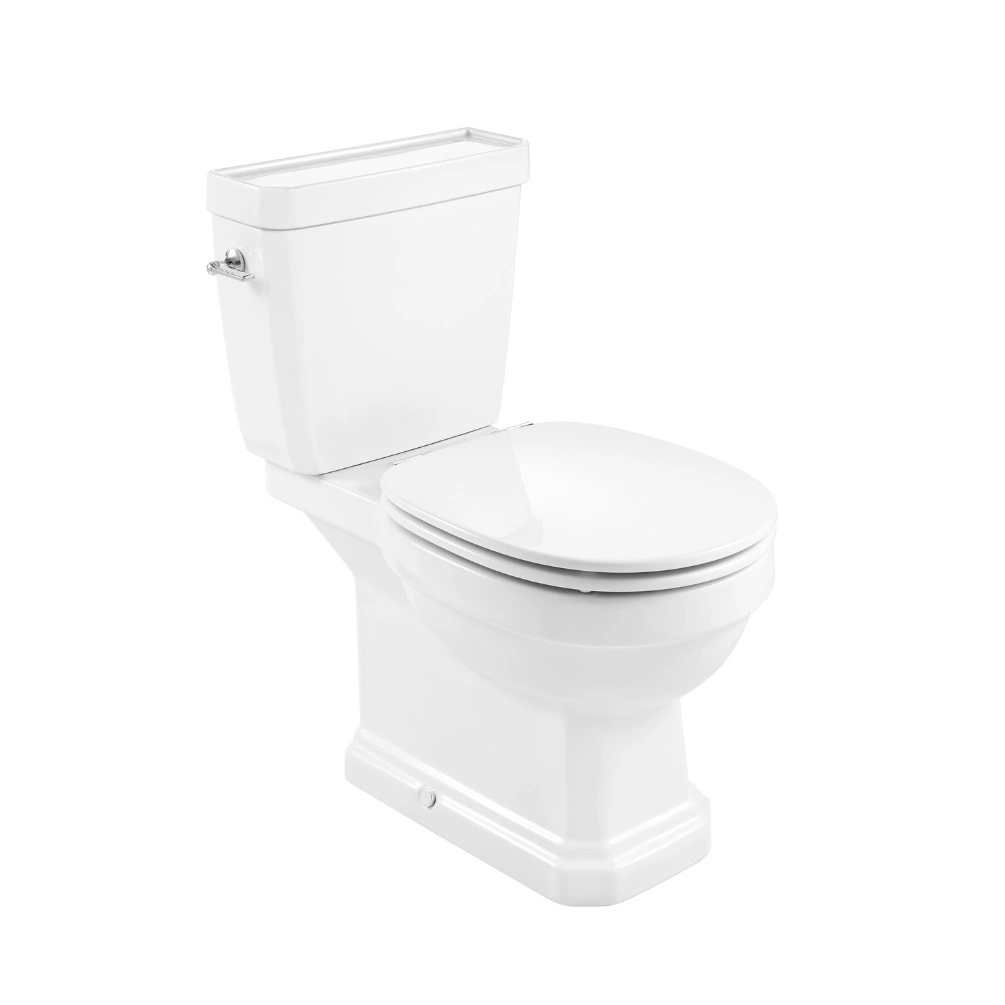 This traditional close coupled toilet features a straight-edged, open-back design paired with a rounded rimless pan, a soft-close seat, and a sleek dual-flush cistern. Together, these features radiate sophistication from every angle. As a close-coupled configuration, the cistern is connected directly to the pan, resulting in a streamlined, cohesive appearance that keeps your bathroom looking tidy.