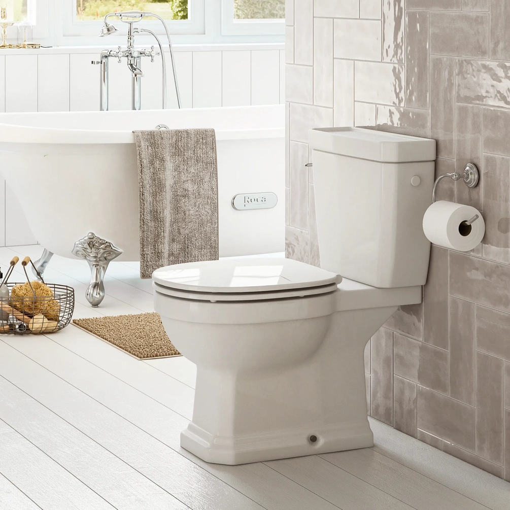 Introducing the Carmen Rimless Close Coupled Toilet by Roca, a remarkable blend of traditional design and contemporary innovation that enhances classic bathroom aesthetics while providing user-friendly features for everyday use.