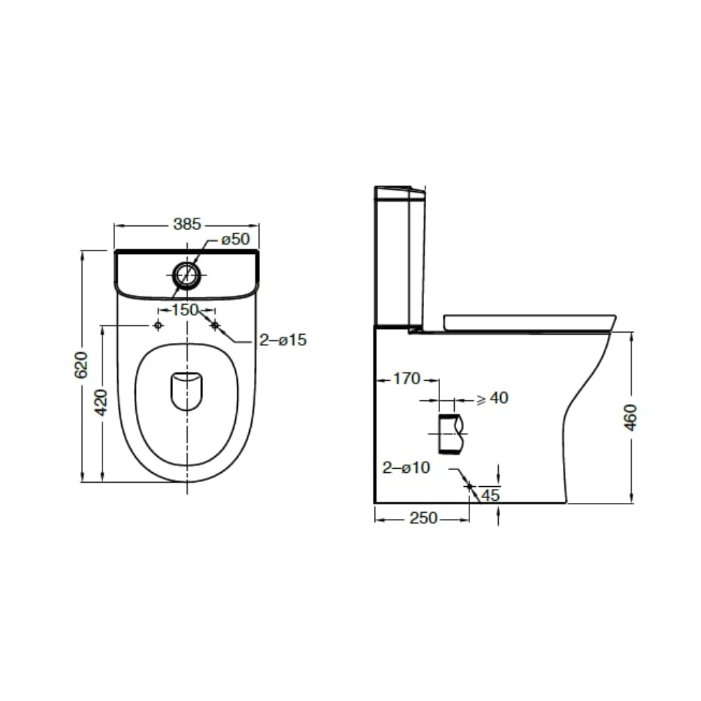 This close coupled toilet, moulded flush to the wall with a box rim pan, showcases an increased comfort height of 460mm from the seat to the floor, designed for taller individuals, as well as those with accessibility and mobility challenges. As a close-coupled WC, it incorporates a dual-flush cistern that offers a 3-litre flush for liquid waste and a 4.5-litre flush for solid waste. This considerate feature supports water conservation with every push of the chrome flush button, positioning the toilet as an eco-friendly option.