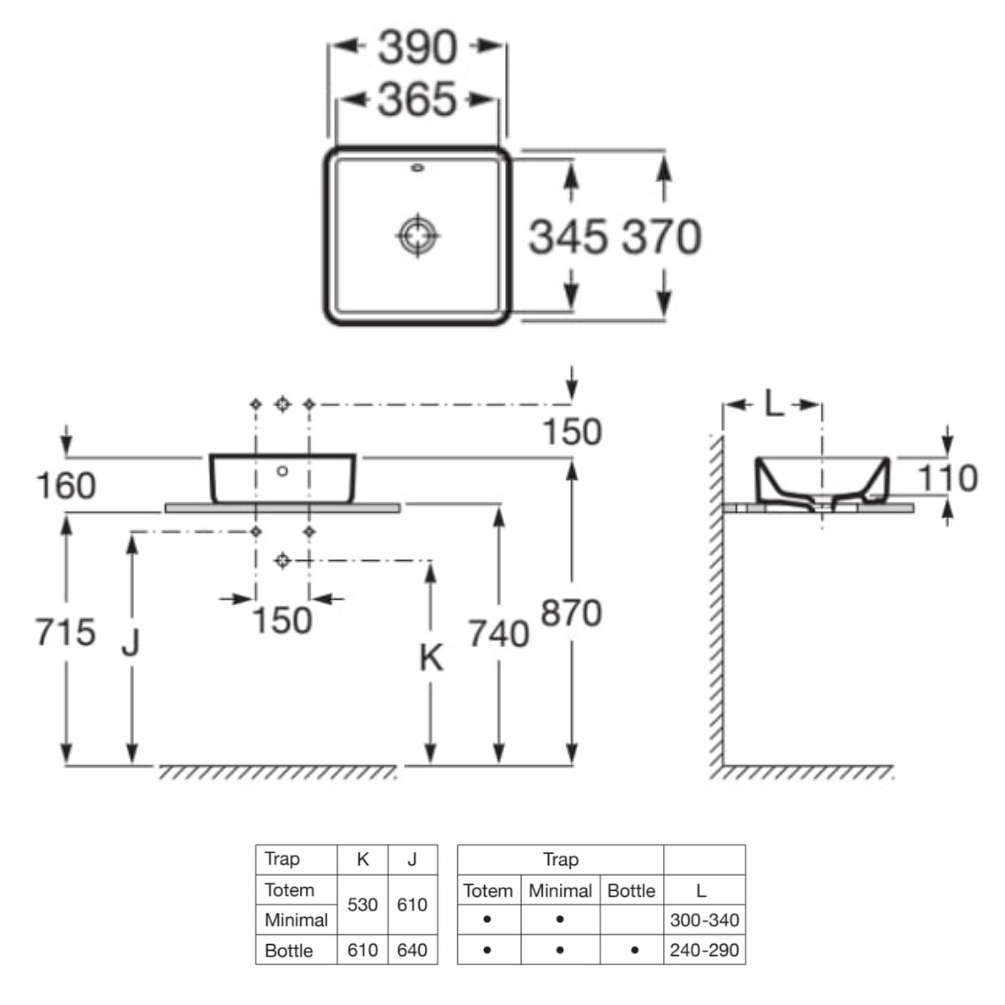 With compact and robust dimensions of 390mm in length, 370mm in width, and 130mm in height, this square countertop basin is perfectly suited to sit on a vanity unit or worktop. Its sleek exterior features thick, straight walls that seamlessly transition into the gently curved bowl, which boasts a depth of 110mm and a generous capacity of 3.9 litres.