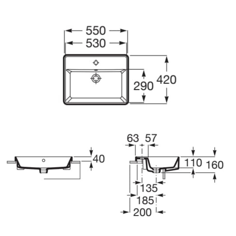 This semi-recessed basin's robust rectangular shape showcases clean lines and softly rounded corners from front to back. Measuring a spacious 550mm in width and an outward depth of 420mm, it provides a generous 7-litre capacity bowl, offering plenty of room for comfortable handwashing. Its thoughtful design allows the basin to be installed with its back recessed into the worktop while the front elegantly overhangs.