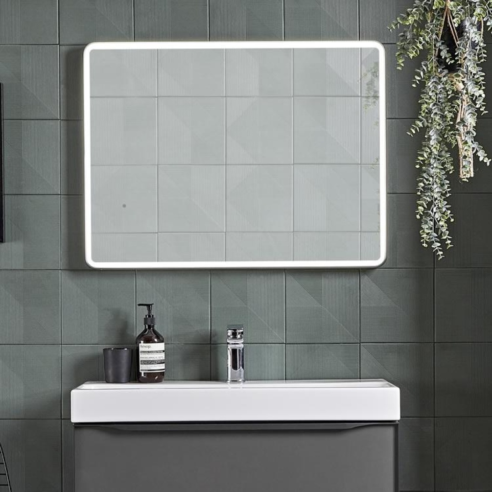 This rectangular mirror features a versatile design that can be hung either horizontally or vertically, with a grey trim and adjustable LED lighting that would suit any modern bathroom space.