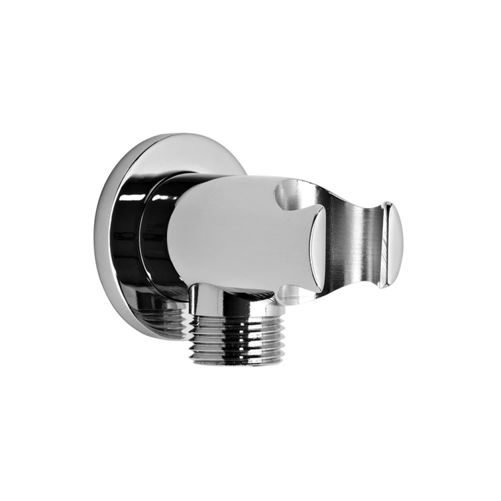 This chrome finished wall elbow features an integrated handset holder that makes it a practical addition to any modern bathroom.