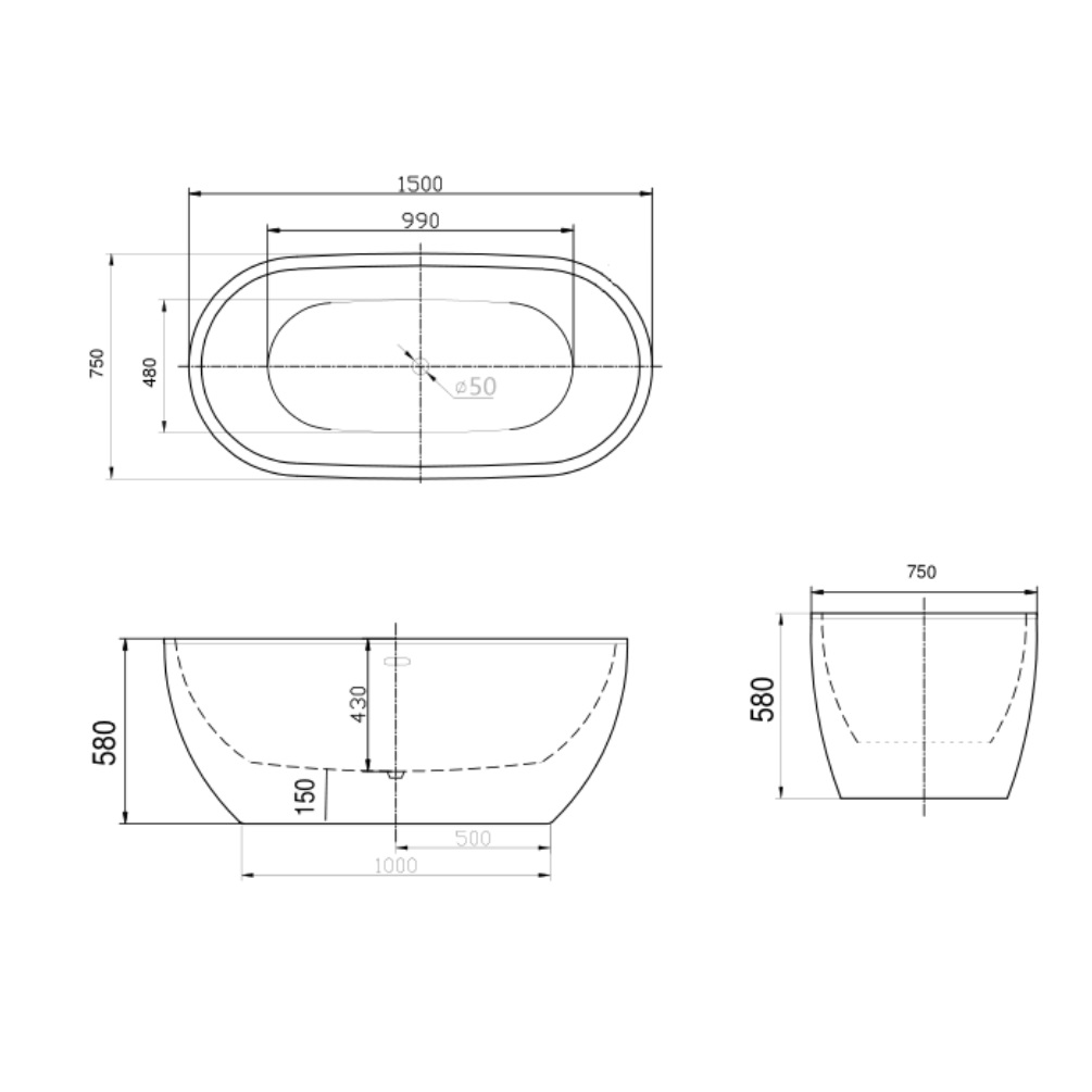 With an oval design, the outside of this freestanding bath is smooth and minimalist, while the 5mm thick acrylic material used provides a crisp, slim rimmed edge at the top. This is painted in a matt white finish both inside and outside, offering brightness and a standard matching colour to any space, while the matted finish means that light won't be reflected or too striking in the space. It also has a double ended feature, which means it can be used from either end. The 1500mm length by 750mm width offered is compact and ideal for both smaller spaces and larger ones alike, without compromising on the overall quality of usage.