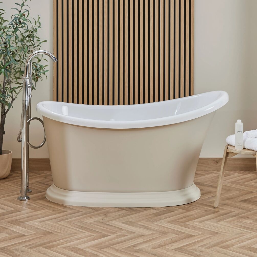 As a slipper bath, it has one end higher than the other for any user to relax into with a single-ended design, and is complemented by a roll-top rim edge consistent with any traditional-styled bathtub. Along with the smooth oval shape, it also features a ridged plinth-like base offering another stylish touch. It is manufactured from 5mm acrylic, and is finished in a bright, gloss white finish that can be included as part of lots of bathroom colour schemes. The bath also has an integrated overflow, and comes pre-fitted with a built-in click clack waste. With no tap holes, it can be placed next to a wall for pairing with stunning wall-mounted bath taps or freestanding bath taps.