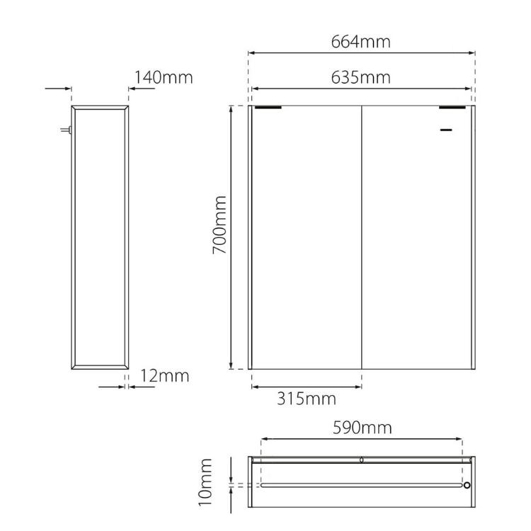 The two cabinet doors, which measure a total of 664mm in width and 700mm in height, are mirrored on both sides to give you the flexibility of using the Ainsley whether it is open or closed. Mirrored panels similarly feature on the sides of the cabinet, which measure 130mm in depth and are framed by diffused LED lights.