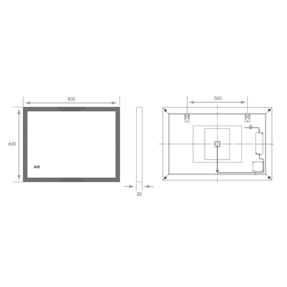 The rectangular face of this illuminated mirror, which measures 900mm in width and 600mm in height, is framed by a bold border of colour changing LED lights that are controlled via the two touch sensor buttons located in its bottom left corner.