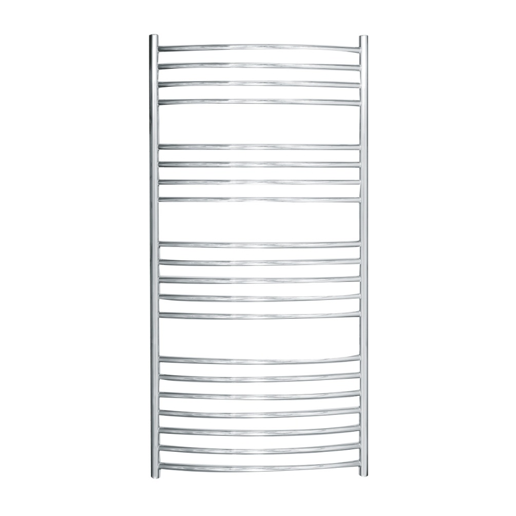 As conventional traditional ladder rails hug the wall, The Sussex Range by JIS Adur 1250mm x 620mm Polished Stainless Steel Curved Electric Towel Rail expresses depth and brings sophistication to bathroom walls.